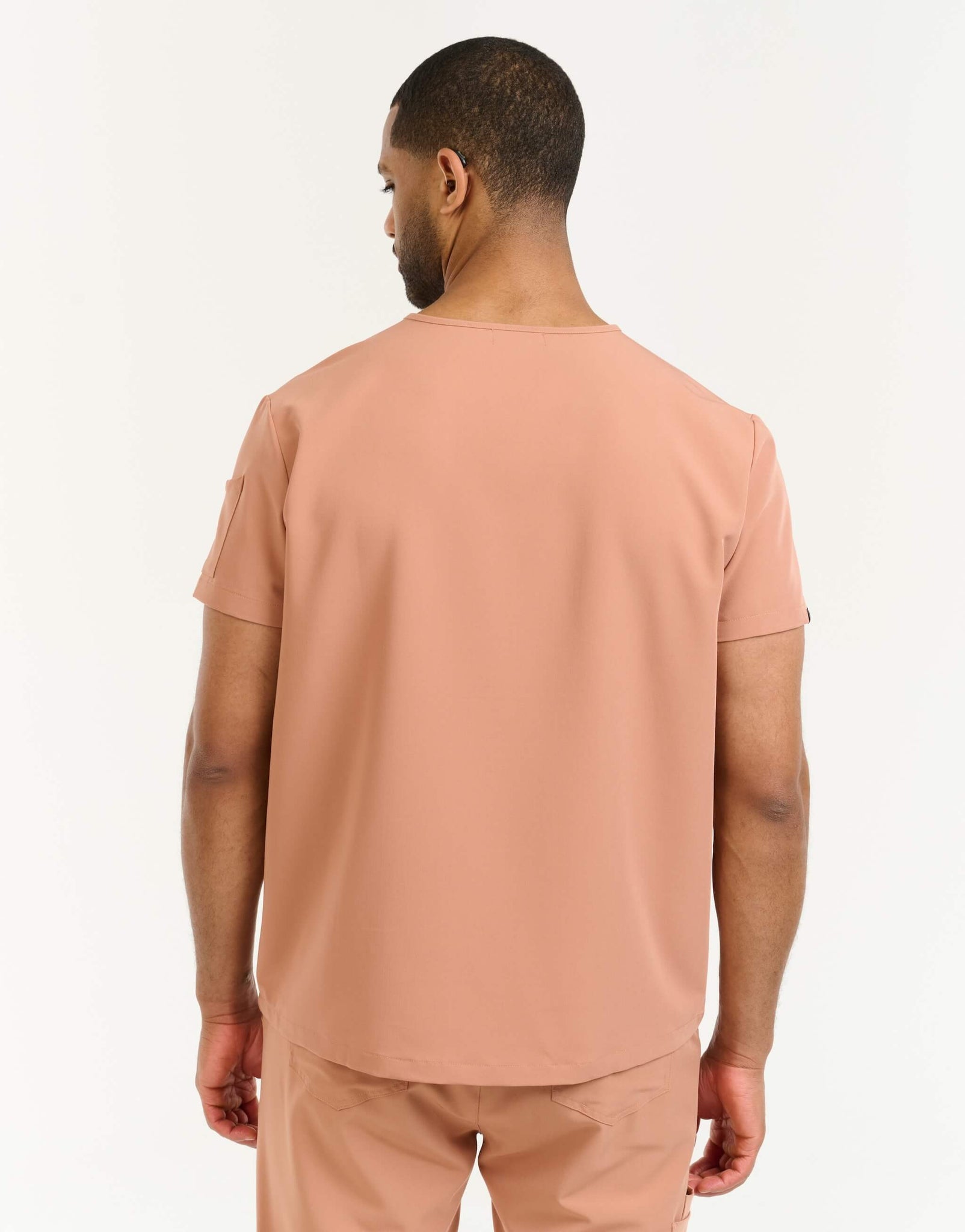back view of peach one pocket v neck scrub top