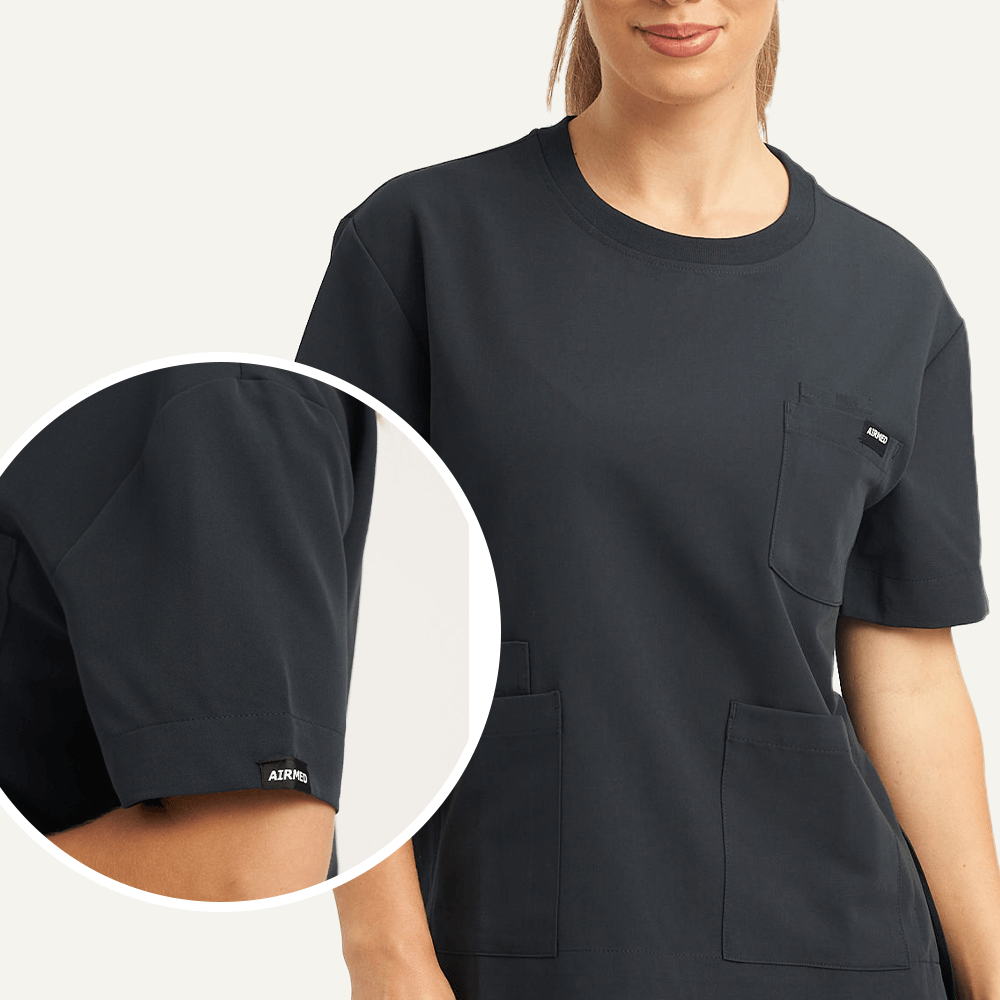 With a relaxed, unstructured back, drop-shoulder sleeves, and a high-coverage neckline, The Crew Neck Scrub Top delivers a roomy, comfortable fit