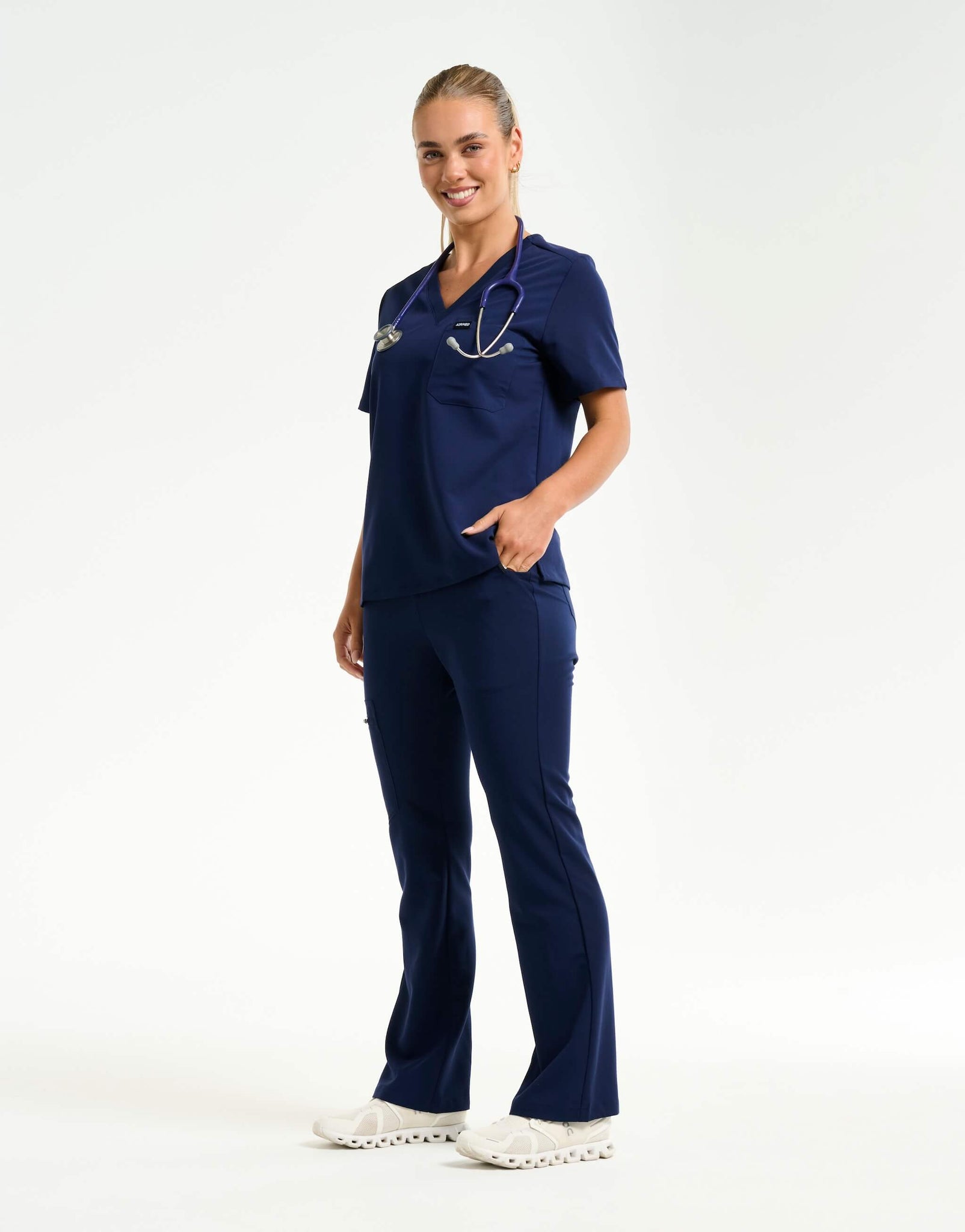 The modern classic, high waisted and flare leg pant that is the perfect pair for your essential work wardrobe. Made up of our soft proprietary blend with added SIL-FIBRE and the right amount of stretch and flare to keep you comfortable and stylish on and off shift.