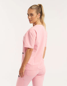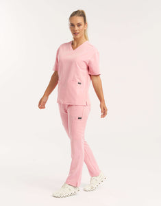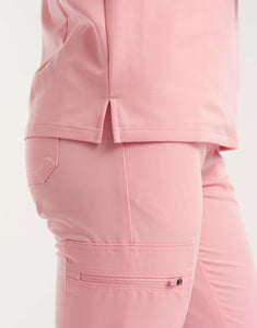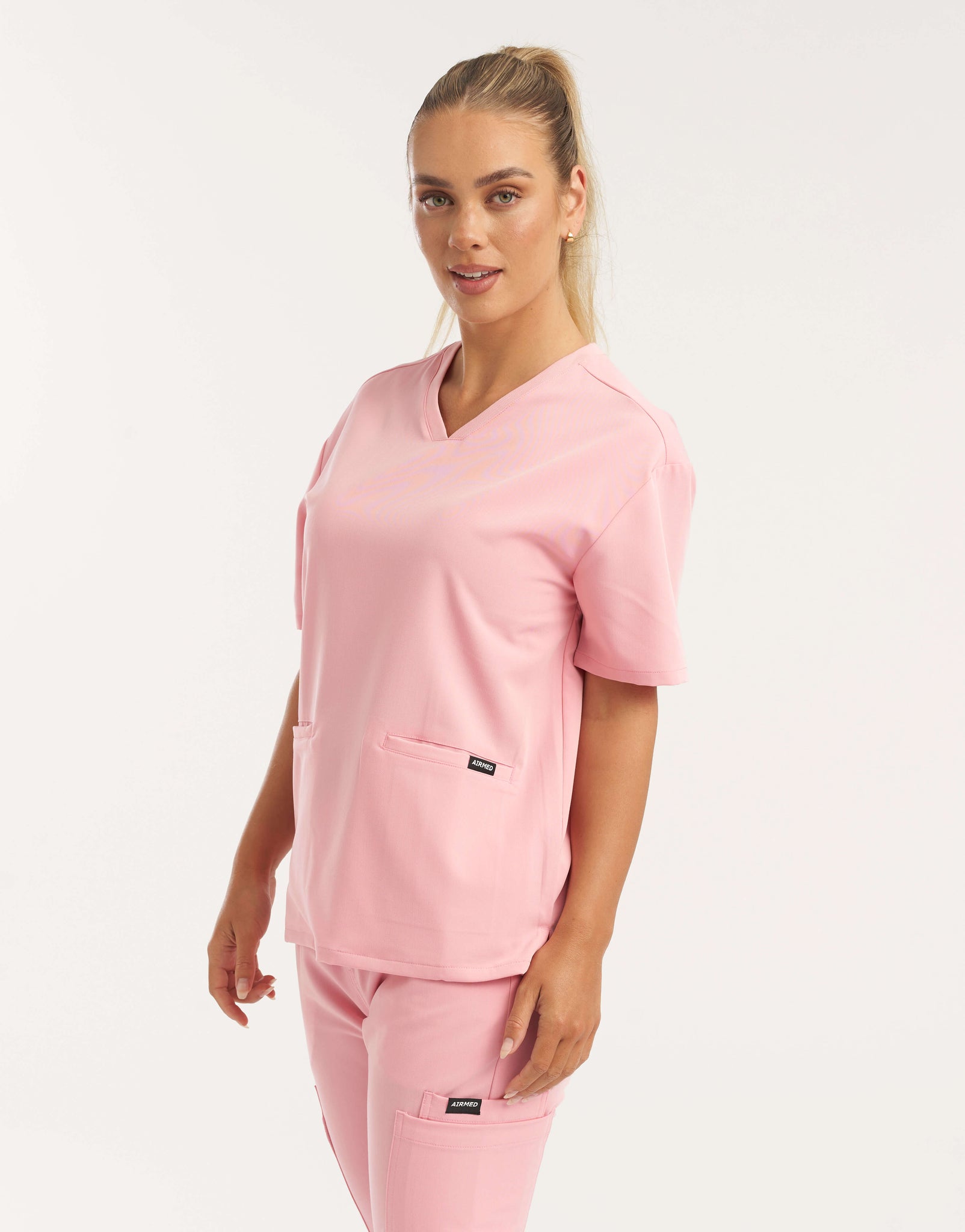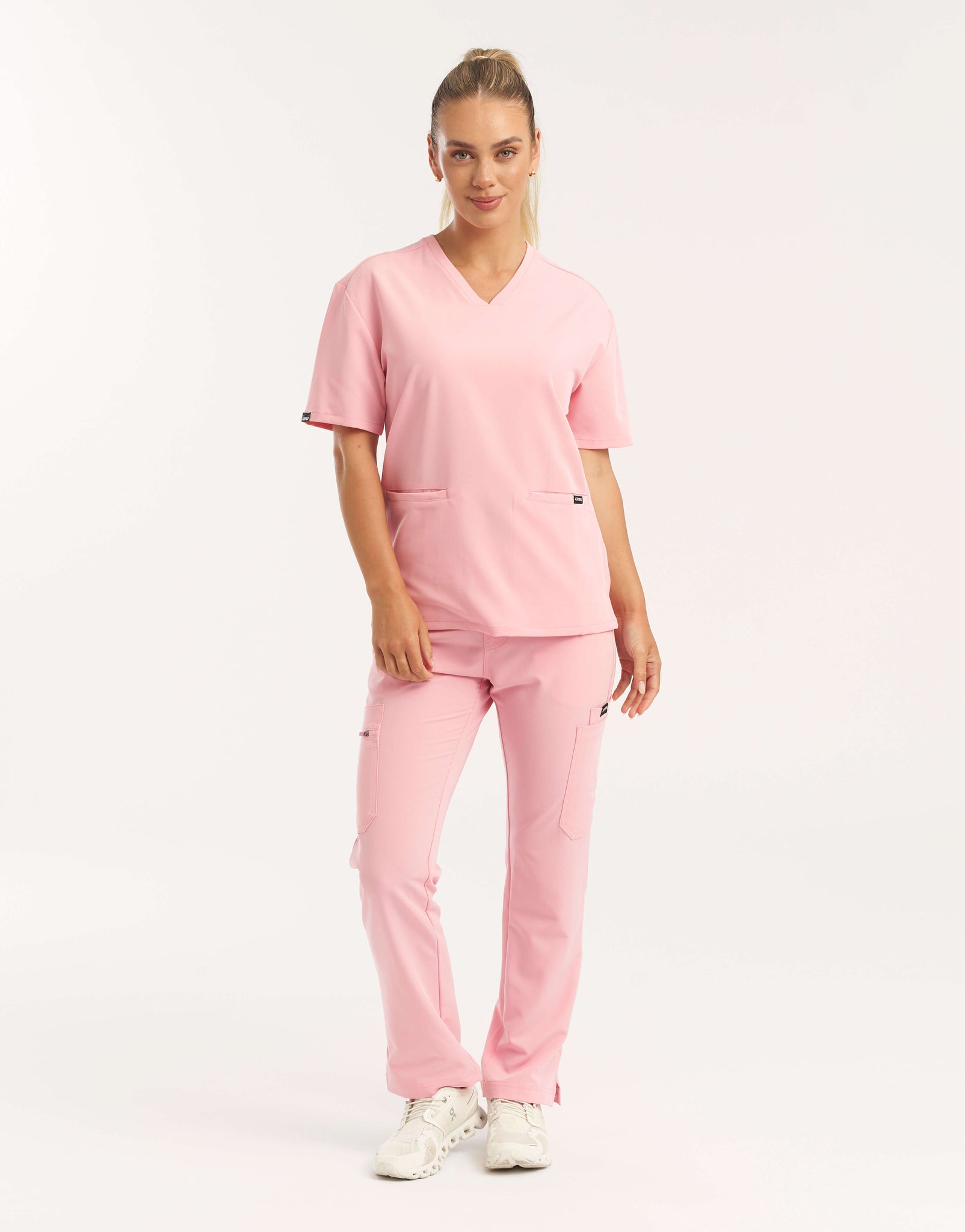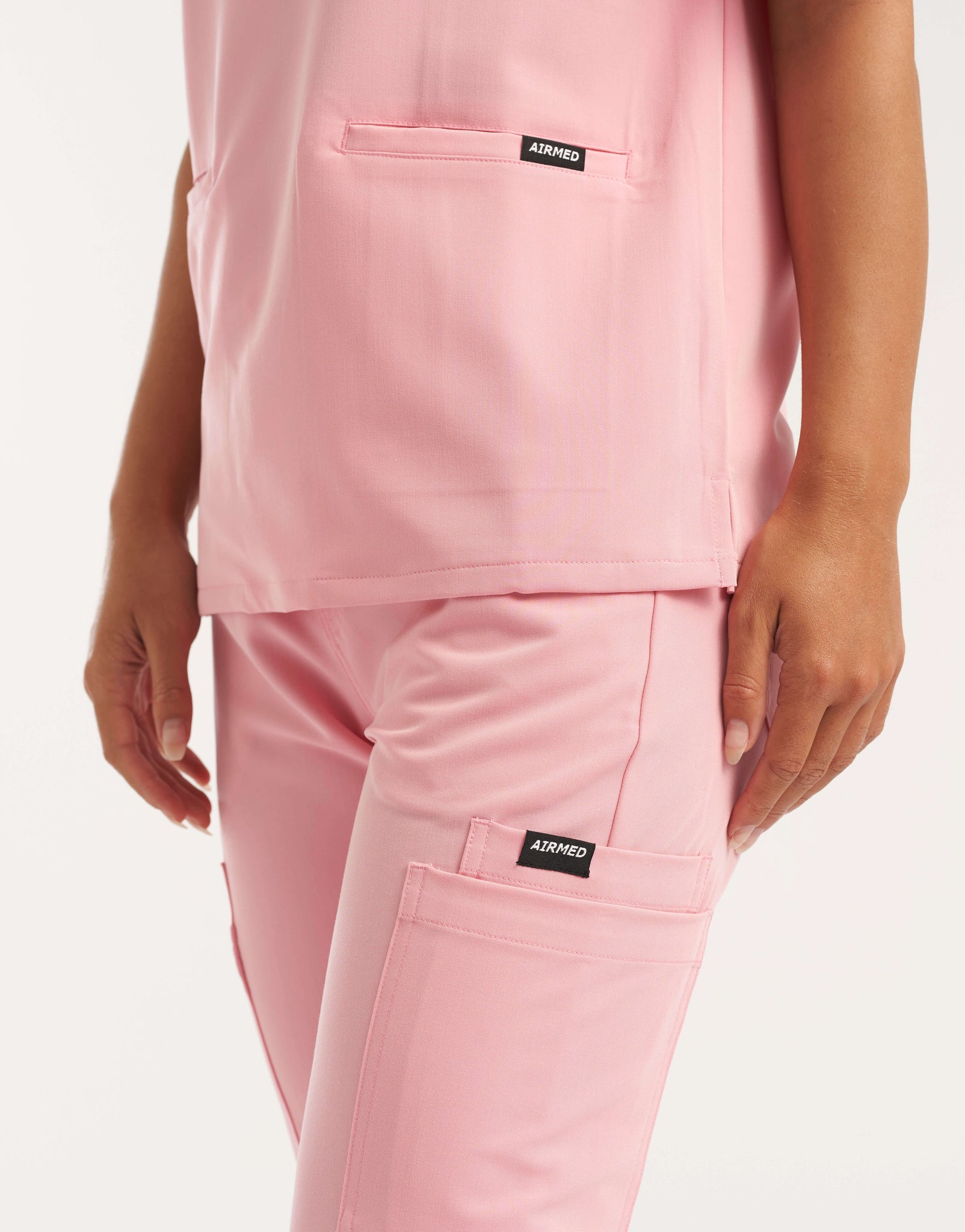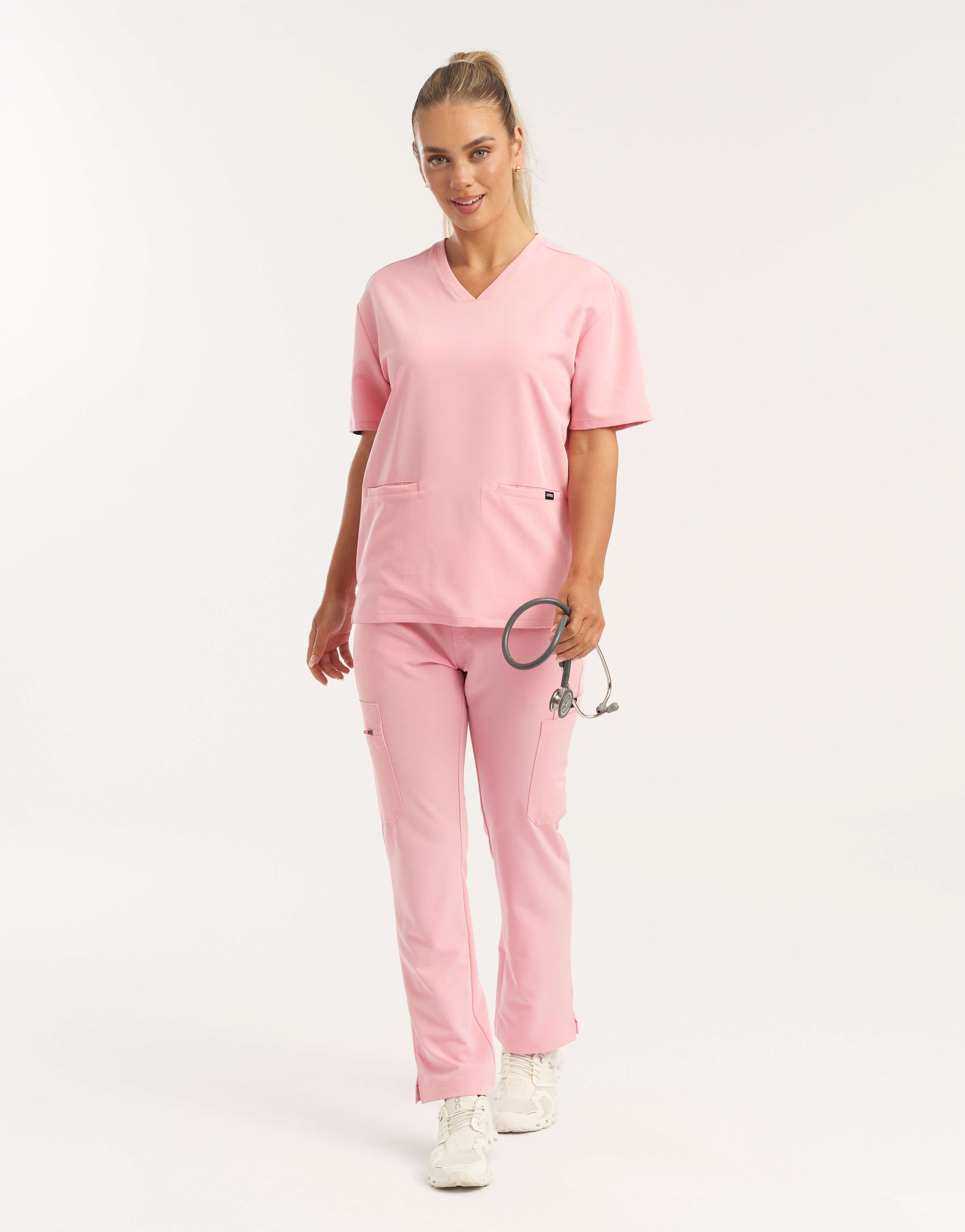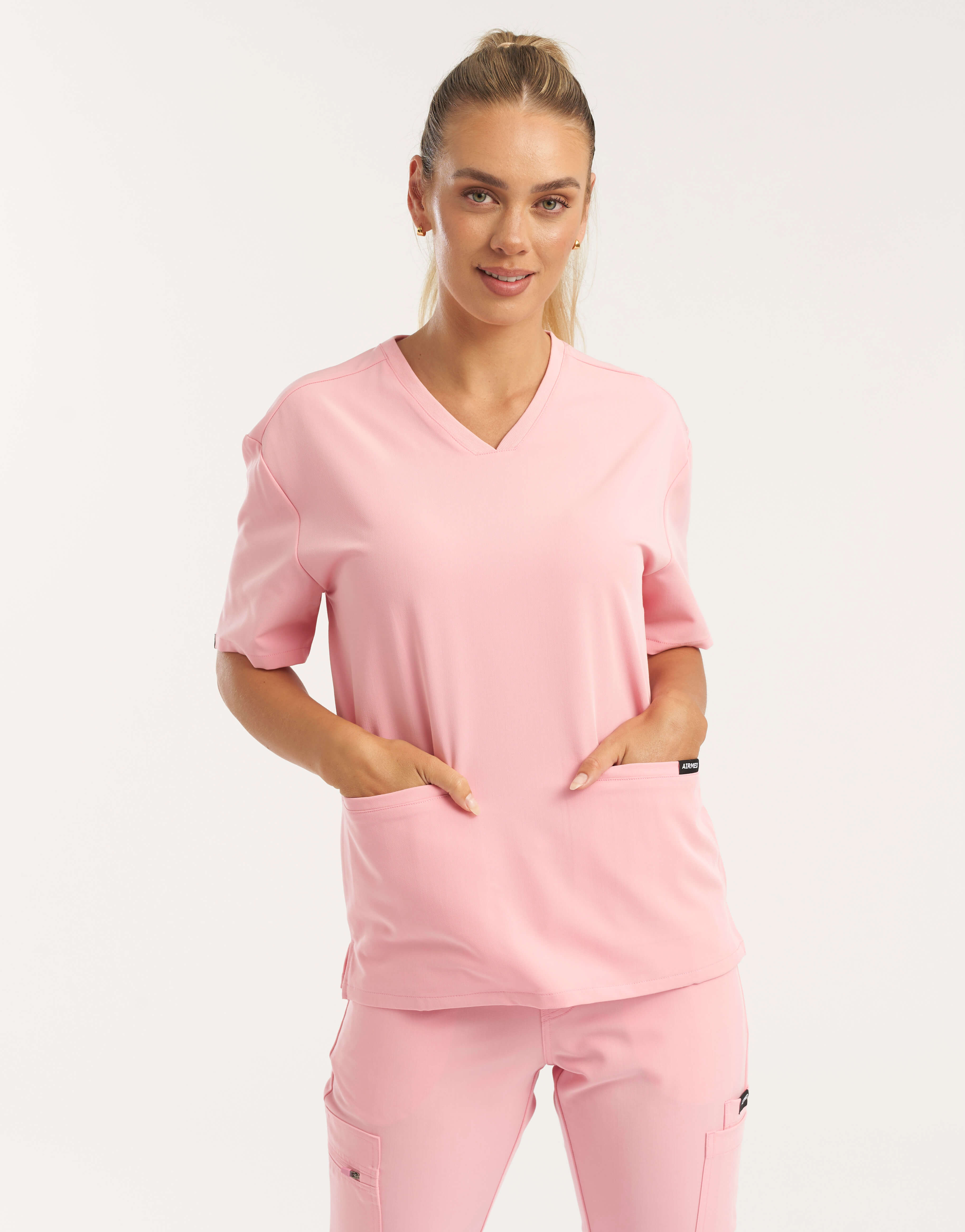 Like any light-coloured fabric, darker undergarments may be more visible under our Musk Pink scrubs. For the best coverage, we recommend wearing light or nude base layers.